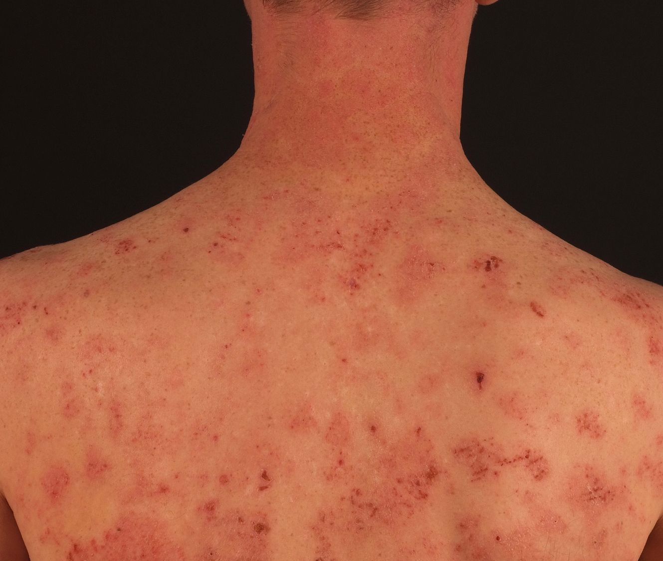 Bild: Rücken mit typischen Hautveränderungen einer ausgeprägten Form einer nummulären Dermatitis.